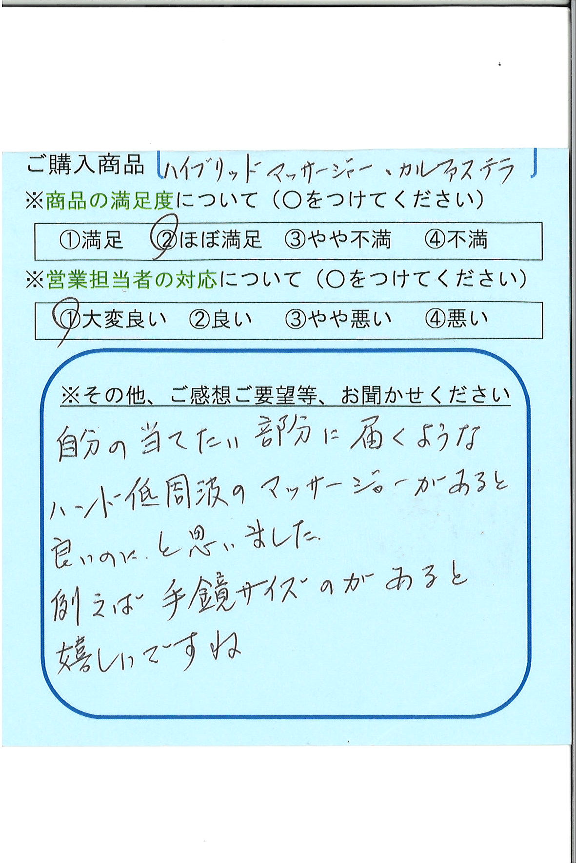 自分の当てたい部分に届くようなハンド低周波のマッサージャーがあればいいのにと思いました。