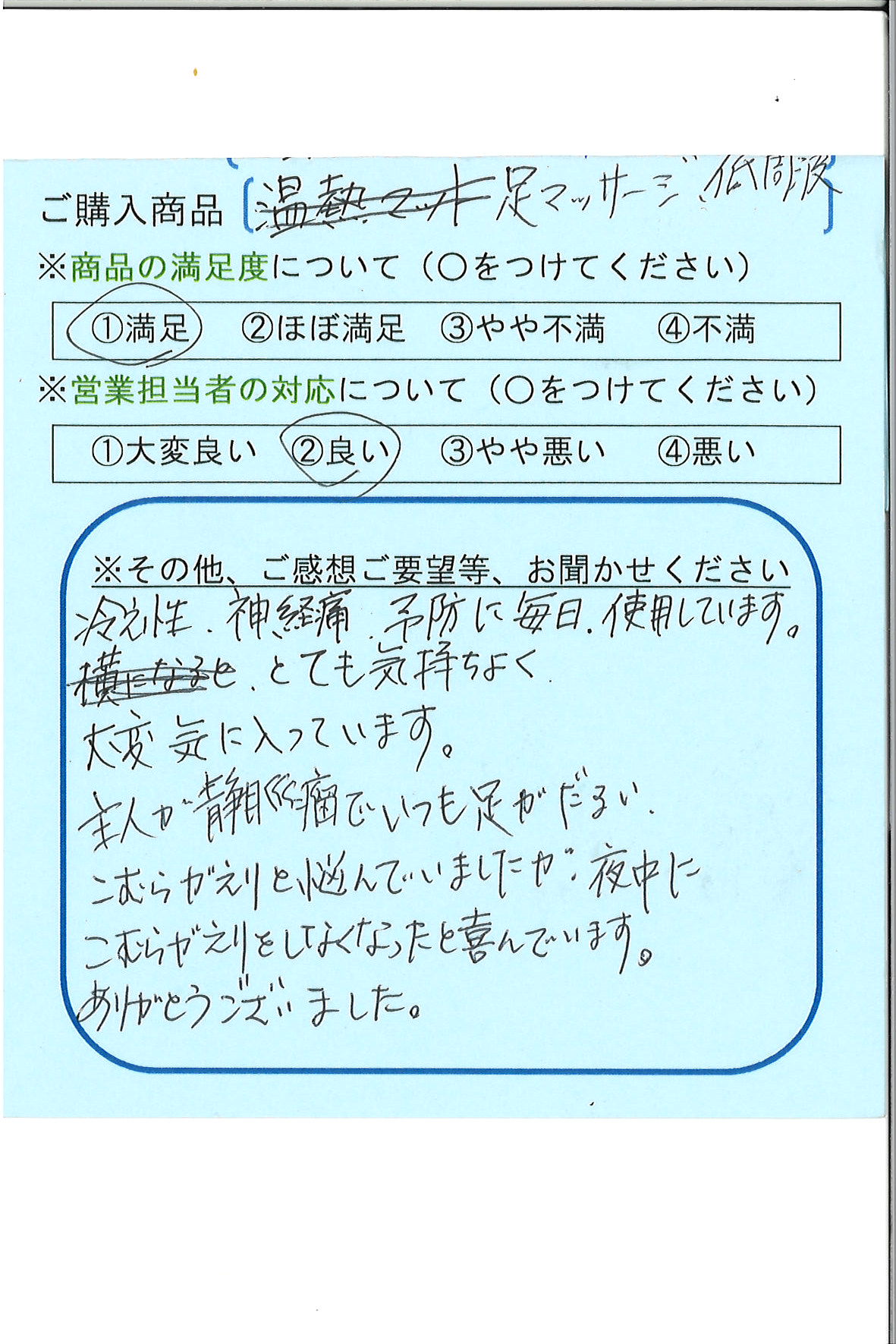 主人が静脈瘤でいつも足がだるい。こむらがえりを悩んでいましたが、夜中にこむらがえりをしなくなったと喜んでいます。