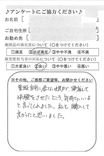 普段自宅にいない嫁が帰省して 体験させたところ、気持ちいいよ と言ってくれました。私も購入して 良かったと思いました。