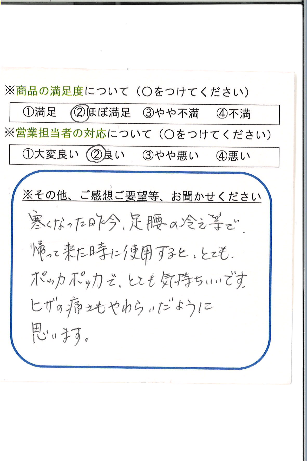 寒くなった昨今、足腰の冷え等で帰ってきた時に使用すると、とてもポッカポッカでとても気持ちいいです。