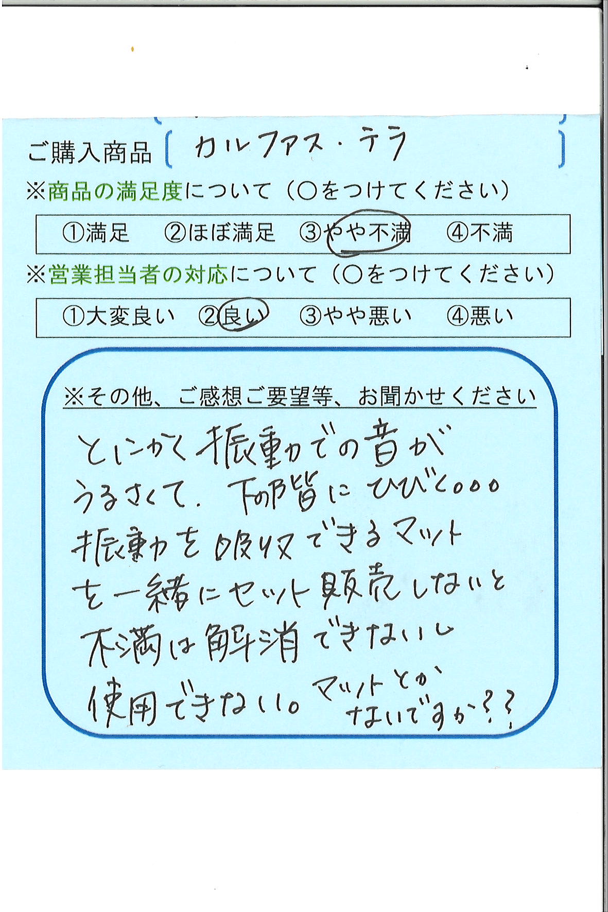 振動を吸収できるマットを一緒にセット販売しないと不満は解消できないし、使用できない。