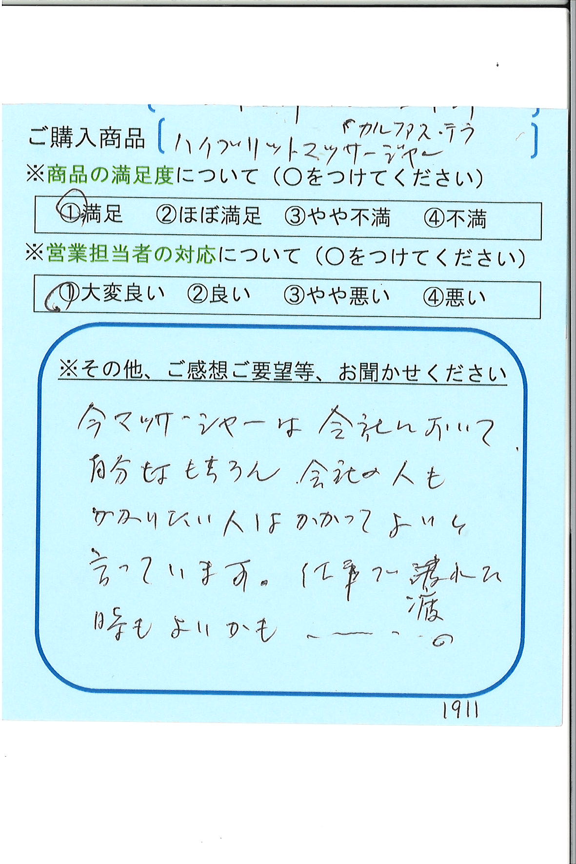 今、マッサージャーは会社において、自分はもちろん、会社の人のかかりたい人はかかってよいと言っています。