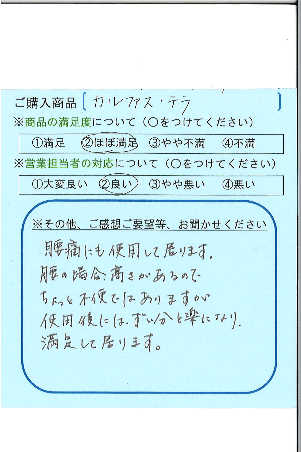 腰の場合、高さがあるのでちょっと不便ではありますが、使用後にはずい分と楽になり、満足して居ります。