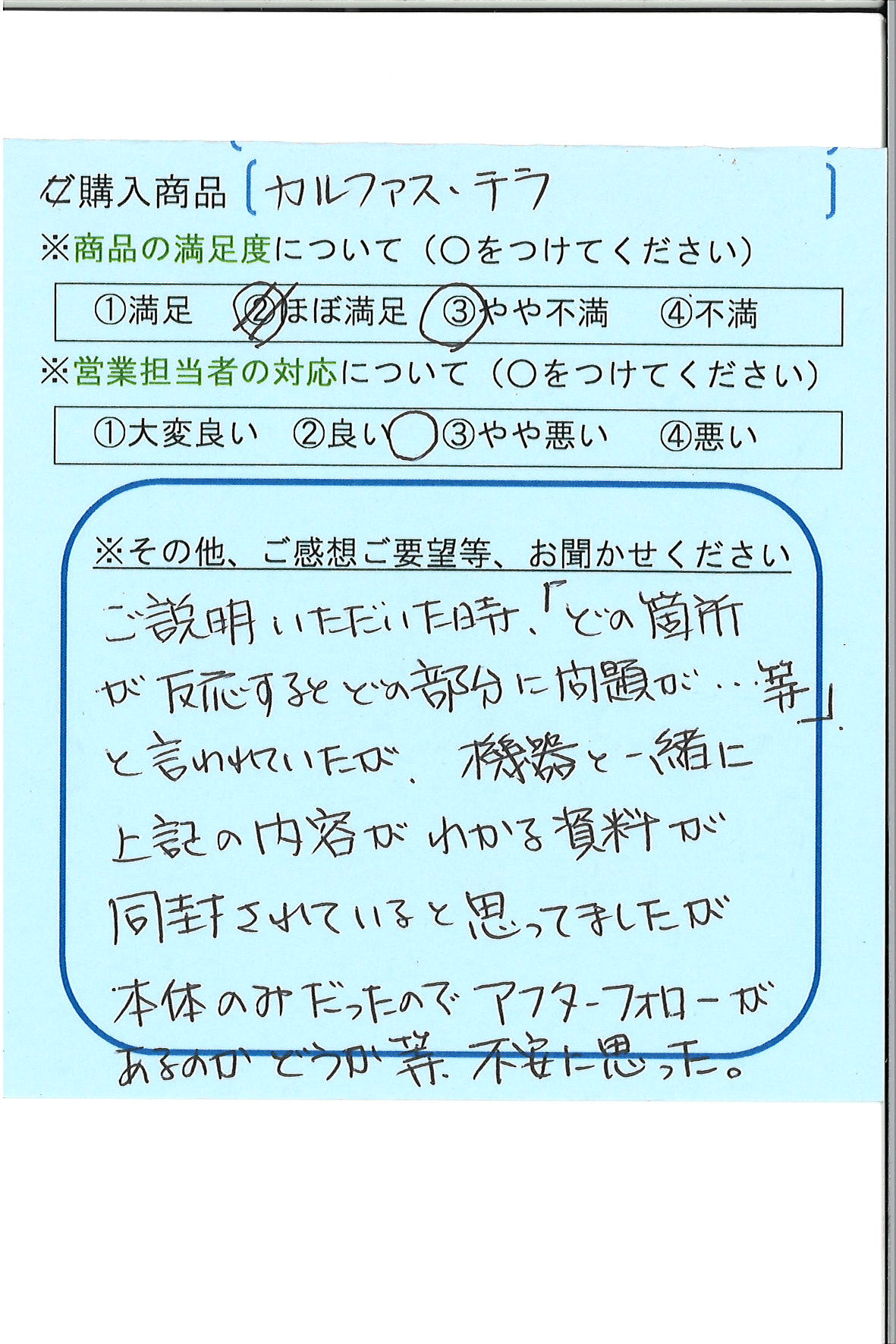 ご説明いただいた時「どの箇所が反応するとどの部分に問題が…等」と言われていたが、機器と一緒にこの内容がわかる資料が同封されていると思ってましたが、本体のみだったのでアフターフォローがあるのかどうか等不安に思った。