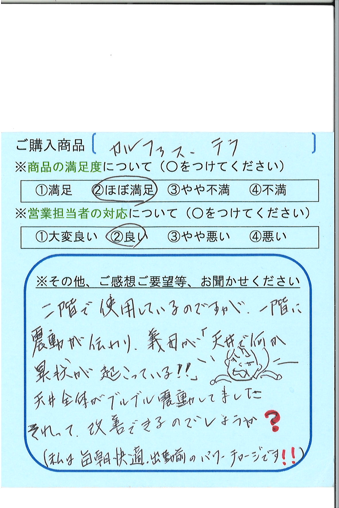 二階で使用しているのですが、一回に震動が伝わり、義母が「天井で何か異常が起こっている!!」天井全体がブルブル震動してました。
