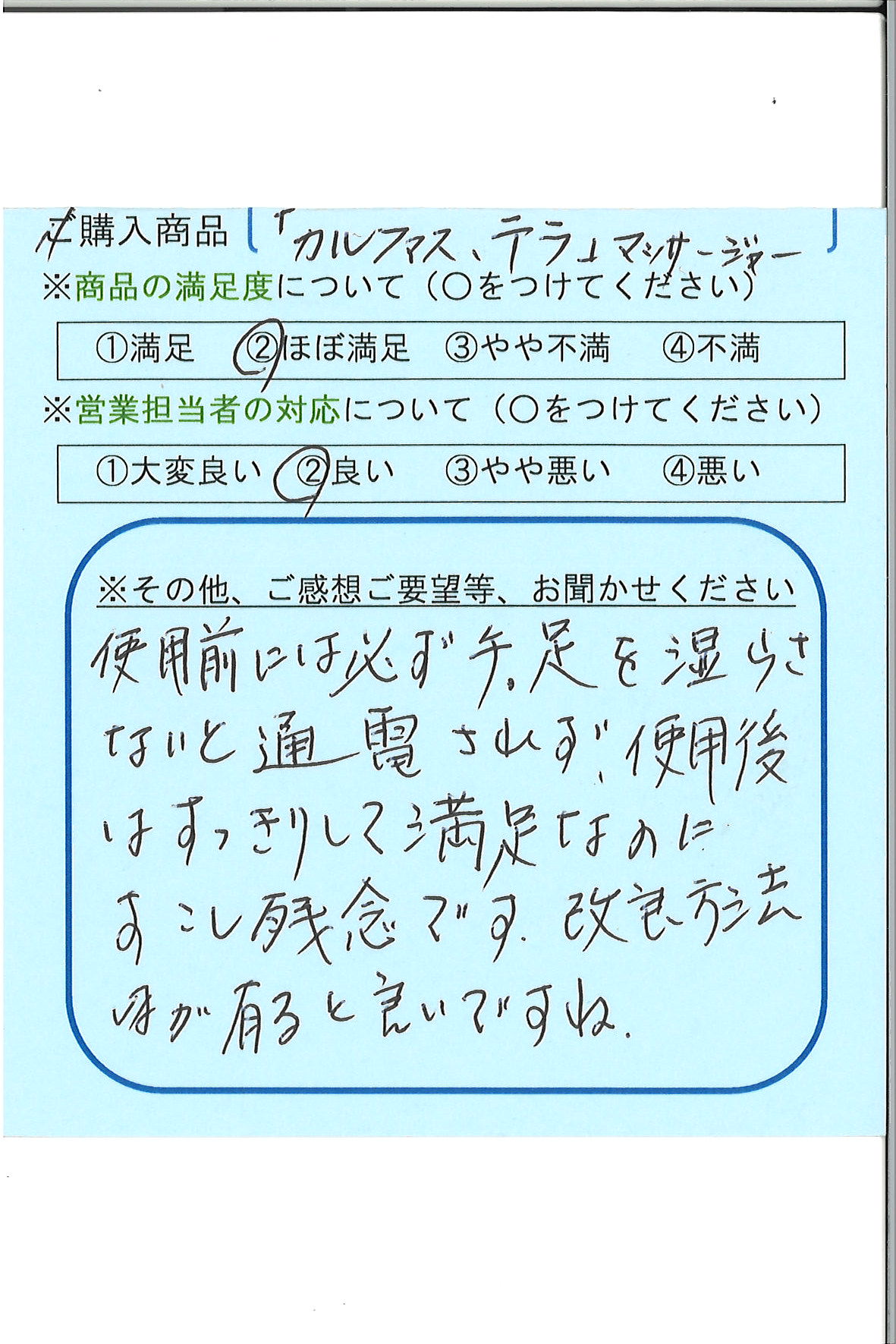 使用前には、必ず手足を湿らさないと通電されず、使用後はスッキリして満足なのに少し残念です。