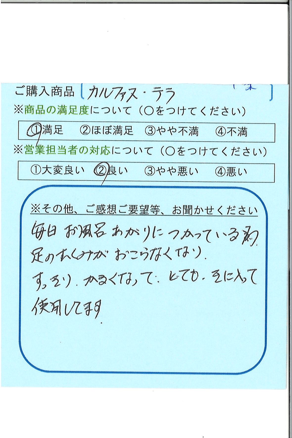 毎日お風呂上りに使っている為、足のむくみがおこらなくなり、すっきり軽くなってとても気に入って使用してます。