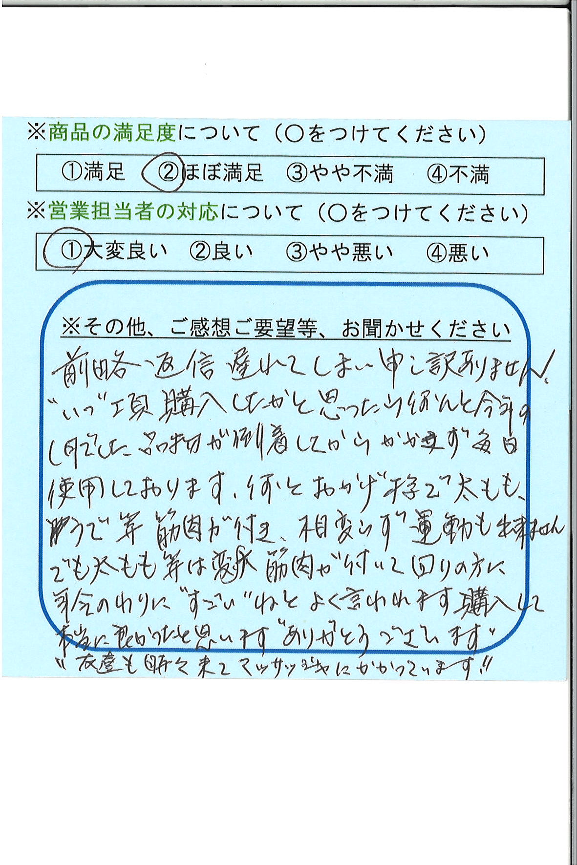 品物が到着してから、かかさず毎日使用しております。何とおかげ様で、太もも、うで等に筋肉が付き、相変わらず運動も出来ませんが、太もも等は大変筋肉が付いて、回りの方に、年齢のわりに〝すごいね″とよく言われます。購入して本当に良かったと思います。ありがとうございます。