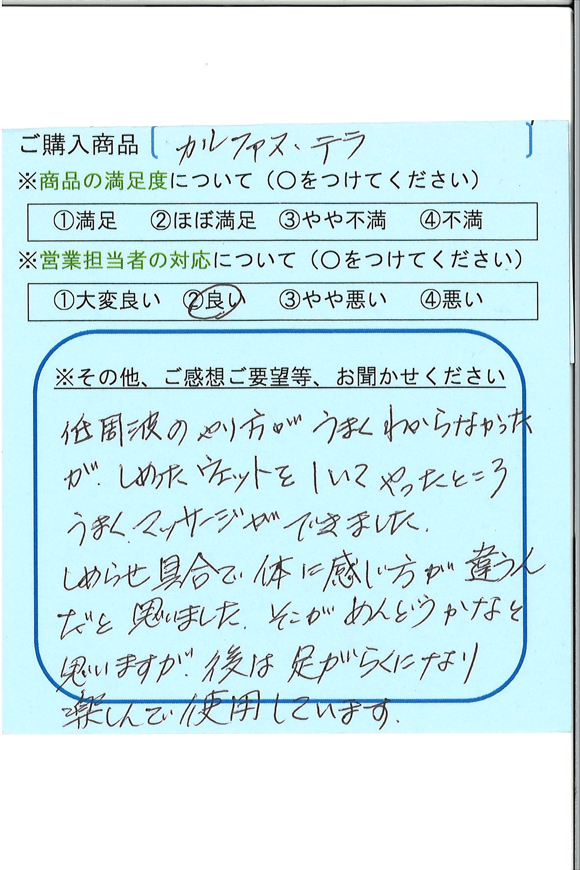低周波のやり方がうまくわからなかったが、しめったウェットをしいてやったところ、うまくマッサージができました。