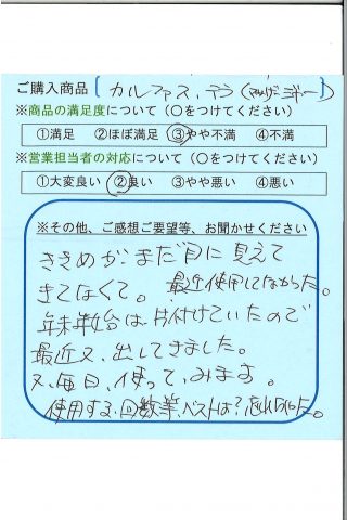 ききめがまだ目に見えてきてなくて。最近使用してなかった。年末年始は片付けていたので、最近また出してきました。又、毎日使ってみます。使用する回数等ベストは?忘れちゃった。