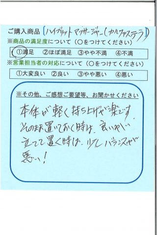 本体が軽く持ち上げが楽です。そのまま置いておく時は良いが、立てて置く時は少しバランスが悪い!
