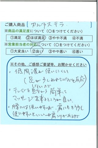 ○低周波が使いにくい(足が少しぬれていないと反応しないので)○テレビを見ながら簡単にマッサージ出来るところが良い。○腰には使いやすいが、肩にももう少し使いやすいといい➡肩こりがあるので