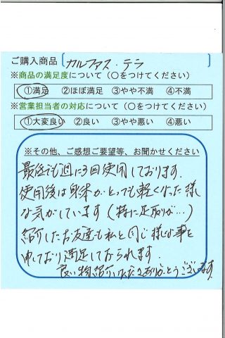 最低でも週に3回使用しております。使用後は身体がとても軽くなった様な気がしています。(特に足取りが…)紹介したお友達も私と同じ様な事を申しており、満足しておられます。良い物紹介いただきありがとうございます。