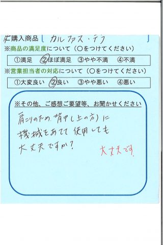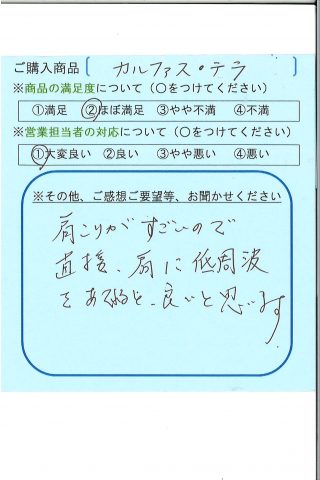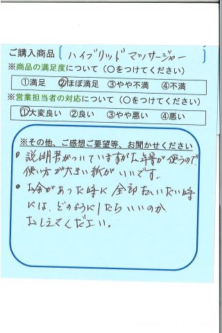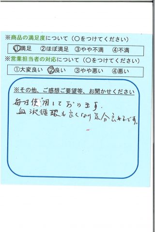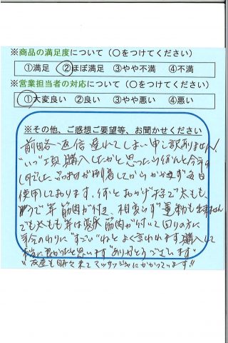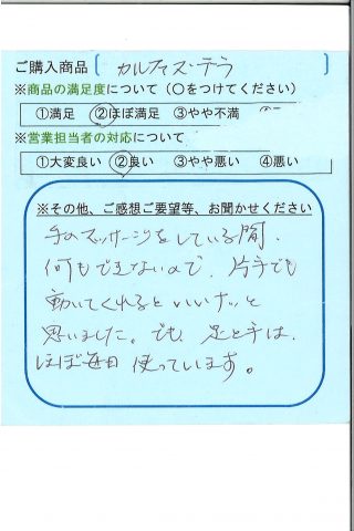 前略 返信遅れてしまい申し訳ありません。いつ頃購入したかと思ったら、何と今年の1月でした。品物が到着してから、かかさず毎日使用しております。何とおかげ様で、太もも、うで等に筋肉が付き、相変わらず運動も出来ませんが、太もも等は大変筋肉が付いて...