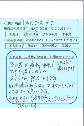足の裏が疲れた時(つったように痛くなります)マッサージ機にのると温かくなり軽くなります。低周波のあるものは初めてなのでとても良いと思います。わかりやすい(活用法)パンフレットが欲しいです。