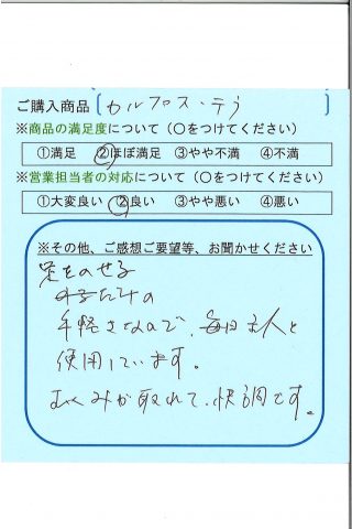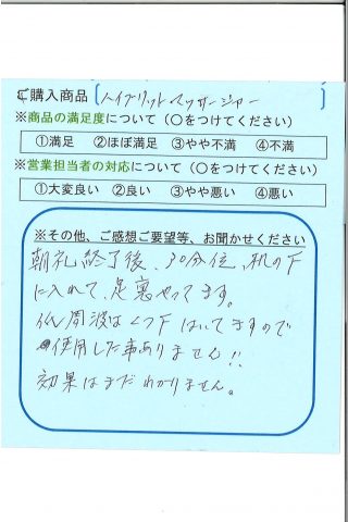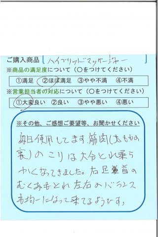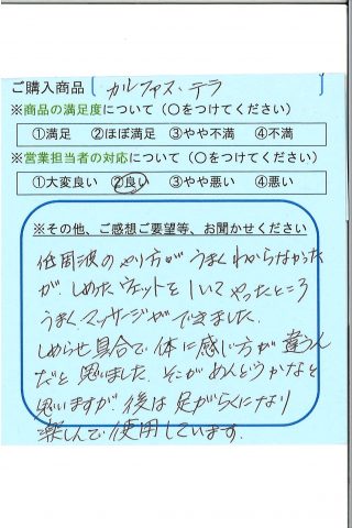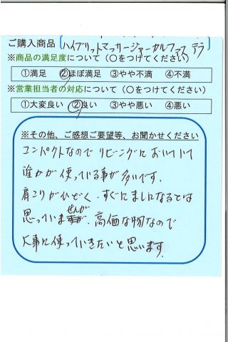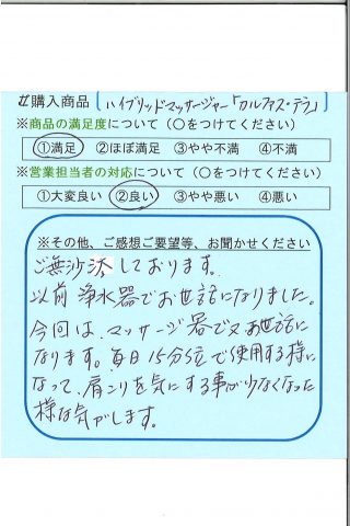 ご無沙汰しております。以前浄水器でお世話になりました。今回はマッサージ機でお世話になります。毎日15分位使用するようになって、肩こりを気にする事が少なくなった様な気がします。