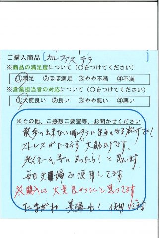 散歩の出来ない時に、テラに足をのせるだけで、ストレスがたまらず大助かりです。老人ホーム等にあったら!と思います。毎日夫婦で使用しています。※購入して大変良かったと思ってます。たまがわ美温も使用してます。