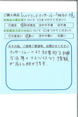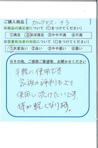 ほぼ毎日使っています。足が軽くなるのは体感できました。説明時に手書き(症状別対応)してくださいましたが、色々な症状別対応冊子があれば送付して頂きたいです。人にも宣伝にもなります。まだまだ活用したいと思ってますので、よろしくお願いします。