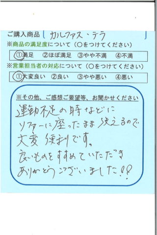 運動不足の時などに、ソファーに座ったまま使えるので大変便利です。良い物をすすめていただき、ありがとうございました!!