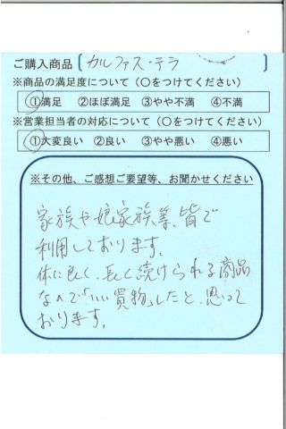 家族や娘家族等、皆で利用しております。体に良く長く続けられる商品なので「いい買い物」したと思っております。