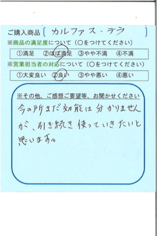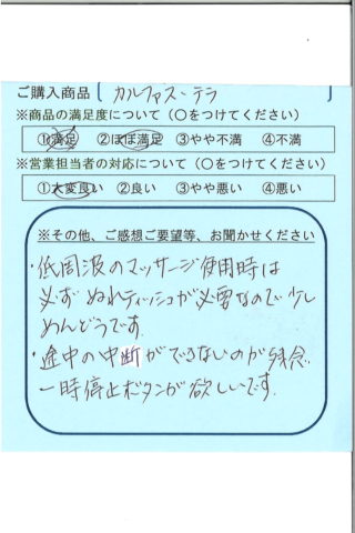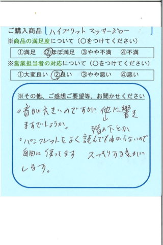 足のむくみや重だるい時に使うと緩和される。職場に来た営業の人も話がおもしろく、分かりやすい説明で良かったです。