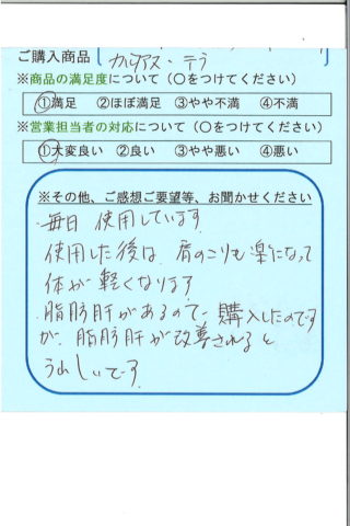 毎日使用しています。使用した後は肩のコリも楽になって体が軽くなります。脂肪肝があるので購入したのですが、脂肪肝が改善されるとうれしいです。