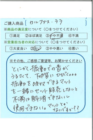 とにかく振動での音がうるさくて、下の階にひびく・・・振動を吸収できるマットを一緒にセット販売しないと不満は解消できないし、使用できない。マットとかないですか?