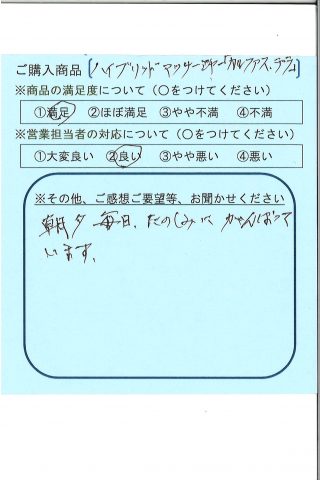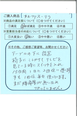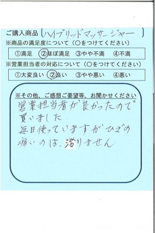 営業担当者が良かったので買いました。毎日使っていますが、ひざの痛いのは治りません。