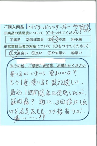 使い方がいまいち曖昧かな?もう一度使い方を教えてほしい。最初の1週間弱、毎日使用したが、筋肉痛?週に3回程にしたけど、右足太もも、つけ根辺りが痛い・・・⁉