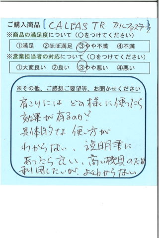 肩こりにはどのように使ったら効果があるのか?具体的な使い方がわからない。説明書にあったら良い。高い器具のため利用したいが、よくわからない。