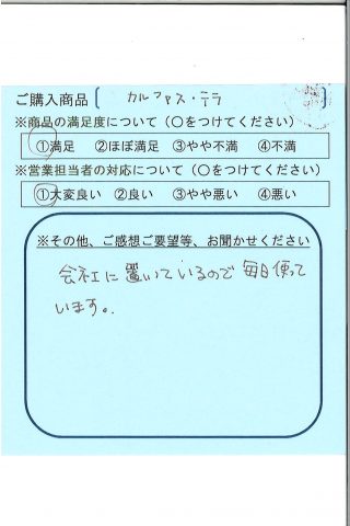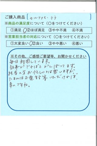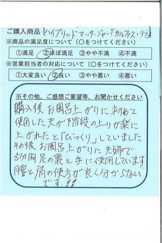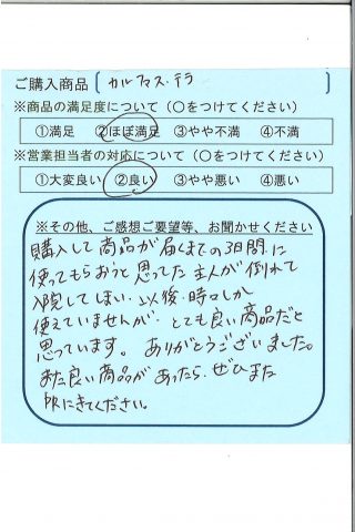 購入して商品が届くまでの3日間に、使ってもらおうと思ってた主人が倒れて入院してしまい、以後、時々しか使っていませんが、とても良い商品だと思います。ありがとうございました。また良い商品があったら、ぜひまたPRにきてください。
