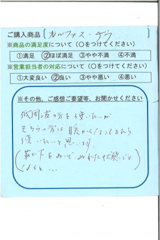 低周波は、気のせいかしら、ひざの痛みが改善されている様です。ヒールを履いていても翌日何でもなくて良いと思います。使い方がまだよくわかっていないので、後日お聞きしたいと思っております(首回りetc)