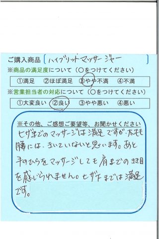 ヒザまでのマッサージは満足ですが、太もも、腰には効いていないと思います。あと、手のひらをマッサージしても肩までの効き目は感じられません。ヒザ下までは満足です。