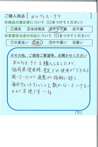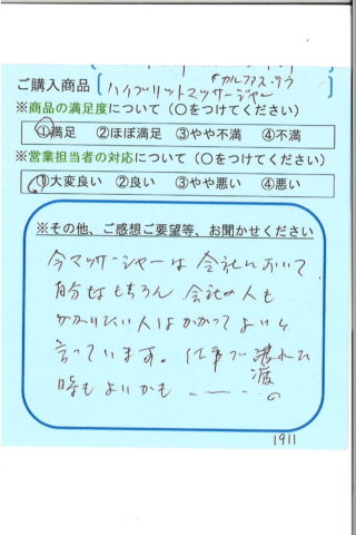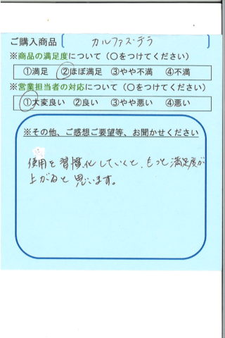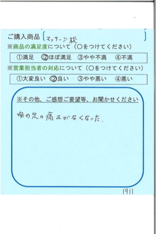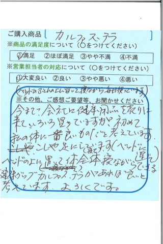 ほぼ毎日使っています。足が軽くなるのは体感できました。説明時に手書き(症状別対応)してくださいましたが、色々な症状別対応冊子があれば送付して頂きたいです。人にも宣伝にもなります。まだまだ活用したいと思ってますので、よろしくお願いします。
