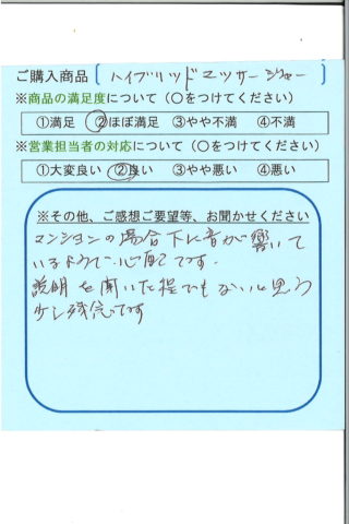 マンションの場合は、下に音が響いているようで心配です。説明を聞いた程でもないと思う。少し残念です。
