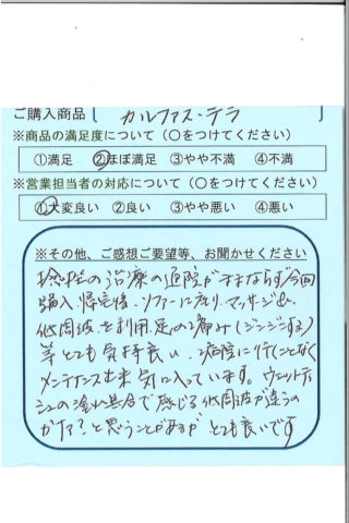毎日、入浴後にマッサージ低周波を欠かさず行っている。調子が良くなっているかどうかの変化はあまり感じないが、期待をもって続けていくことにしています。