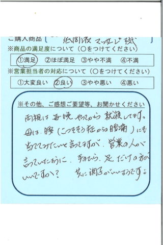 両親は毎晩やってから就寝してます。母は腰(骨粗しょう症からの腰痛)にも当ててみたいと言ってますが、営業の人が言っていたように、手のひら、足だけの方がいいですか?共に調子がいいようです。
