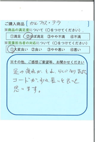 足の疲れが取れ、楽になりました。コードが少々長いと良いと思います。