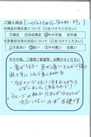 音がうるさい。足が痛い(とんがっている為)寝る前にしたらよく寝れる。低周波の、濡れティッシュがなければ反応しないのが不便です。