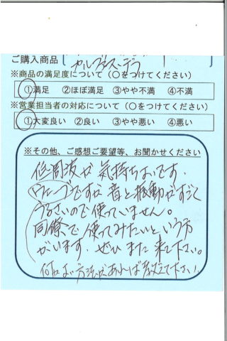 低周波が気持ち良いです。ウェーブですが、音と振動がすごくうるさいので使っていません。何か良い方法があれば教えてください。同僚で使ってみたいという方がいます。ぜひまた来てください。