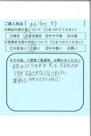 右足のふくらはぎがずっとだるかったのですが、使用して日がたたない内にだるさがなくなりました。